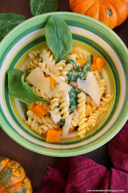 Zapraszam na szybki jesienny obiad makaron ze szpinakiem i dynią i wędzonym kurczakiem.