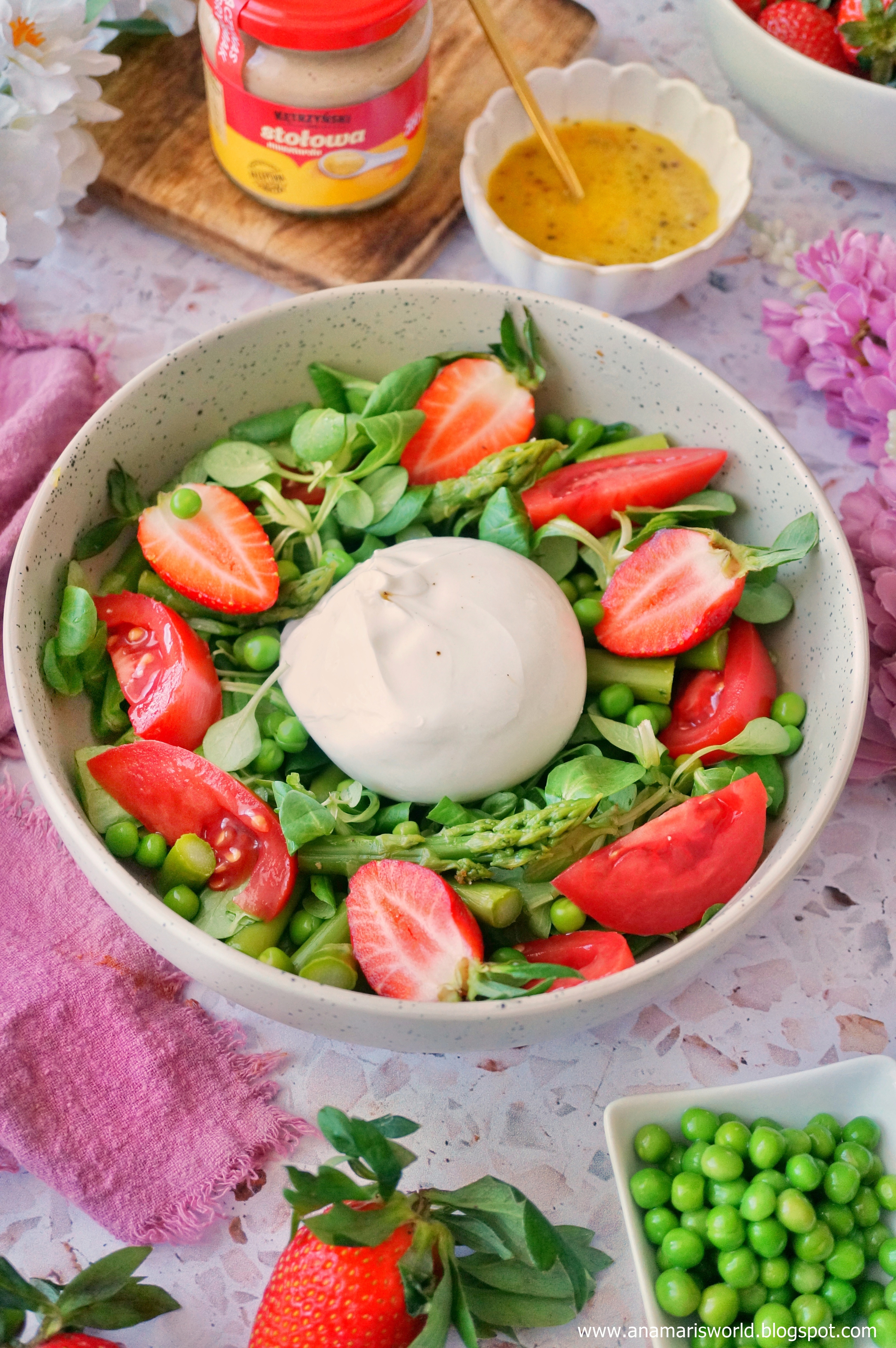 Szybka wiosenna sałatka ze szparagami, truskawkami i burattą.